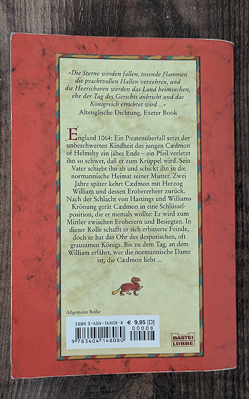 England 1064: Ein Piratenüberfall setzt der unbeschwerten Kindheit des jungen Cædmon of Helmsby ein jähes Ende - ein Pfeil verletzt ihn so schwer, dass er zum Krüppel wird. Sein Vater schiebt ihn ab und schickt ihn in die normannische Heimat seiner Mutter. Zwei Jahre später kehrt Cædmon mit Herzog William und dessen Eroberungsheer zurück. Nach der Schlacht von Hastings und Williams Krönung gerät Cædmon in eine Schlüsselposition, die er niemals wollte: Er wird zum Mittler zwischen Eroberern und Besiegten. In dieser Rolle schafft er sich erbitterte Feinde, doch er hat das Ohr des despotischen, oft grausamen Königs. Bis zu dem Tag, an dem William erfährt, wer die normannische Dame ist, die Cædmon liebt.
