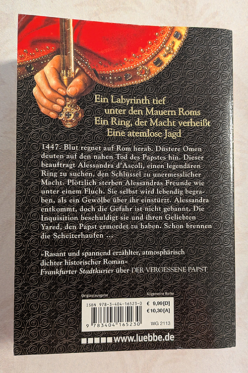 1447. Blut regnet auf Rom herab. Düstere Omen deuten auf den nahen Tod des Papstes hin. Dieser beauftragt Alessandra d?Ascoli, einen legendären Ring zu suchen, den Schlüssel zu unermesslicher Macht. Plötzlich sterben Alessandras Freunde wie unter einem Fluch. Sie selbst wird lebendig begraben, als ein Gewölbe über ihr einstürzt. Alessandra entkommt, doch die Gefahr ist nicht gebannt. Die Inquisition beschuldigt sie und ihren Geliebten Yared, den Papst ermordet zu haben. Schon brennen die Scheiterhaufen?