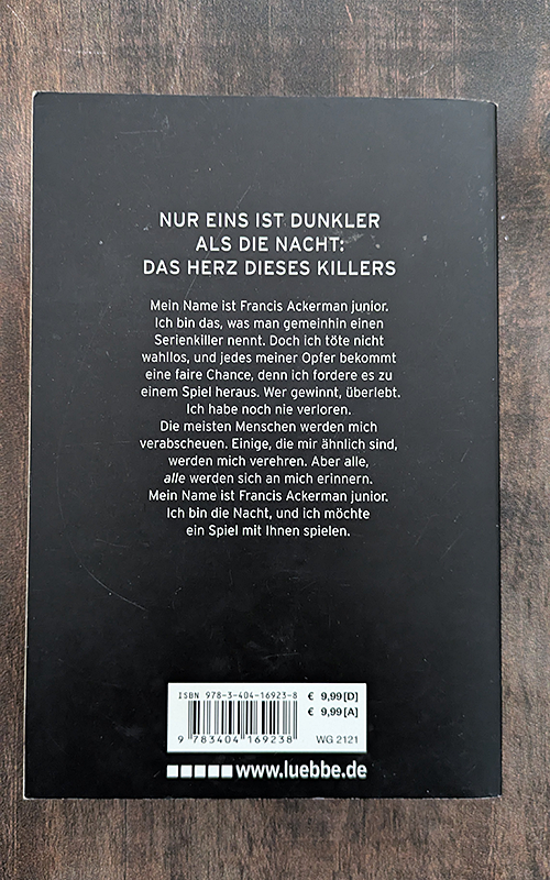 Mein Name ist Francis Ackerman junior. Ich bin das, was man gemeinhin einen Serienkiller nennt. Doch ich töte nicht wahllos, und jedes meiner Opfer bekommt eine faire Chance, denn ich fordere es zu einem Spiel heraus. Wer gewinnt, überlebt. Ich habe noch nie verloren. Die meisten Menschen werden mich verabscheuen. Einige, die mir ähnlich sind, werden mich verehren. Aber alle, alle werden sich an mich erinnern. Mein Name ist Francis Ackerman junior. Ich bin die Nacht, und ich möchte ein Spiel mit Ihnen spielen.