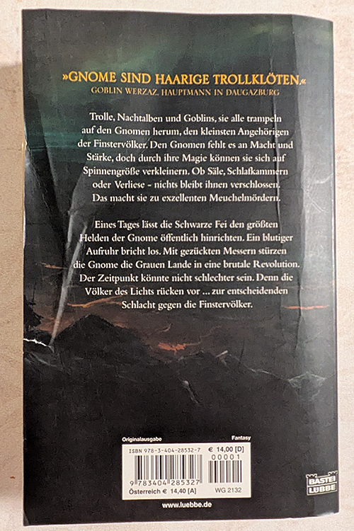 »Gnome sind haarige Trollklöten.« Goblin Werzaz, Hauptmann in Daugazburg Trolle, Nachtalben und Goblins, sie alle trampeln auf den Gnomen herum, den kleinsten Angehörigen der Finstervölker. Den Gnomen fehlt es an Macht und Stärke, doch durch ihre Magie können sie sich auf Spinnengröße verkleinern. Eines Tages lässt die Schwarze Fei den größten Helden der Gnome öffentlich hinrichten. Ein blutiger Aufruhr bricht los. Mit gezückten Messern stürzen die Gnome die Grauen Lande in eine brutale Revolution. Der Zeitpunkt könnte nicht schlechter sein. Denn die Völker des Lichts rücken vor - zur entscheidenden Schlacht gegen die Finstervölker.