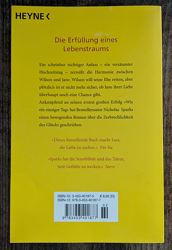 Ein scheinbar nichtiger Anlass - ein versäumter Hochzeitstag - zerreisst die Harmonie zwischen Wilson und Jane. Wilson will seine Ehe retten, aber plötzlich ist er nicht mehr sicher, ob Jane ihrer Liebe überhaupt noch eine Chance gibt. Anknüpfend an seinen ersten grossen Erfolg 'Wie ein einziger Tag' hat Bestsellerautor Nicholas Sparks einen bewegenden Roman über die Kraft der Liebe und die Zerbrechlichkeit des Glücks geschrieben. Nicholas Sparks, 1965 in Nebraska geboren, lebt zusammen mit seiner Frau und den gemeinsamen fünf Kindern in North Carolina. Mit seinen Romanen, die ausnahmslos die Bestsellerlisten eroberten und weltweit in 47 Ländern erscheinen, gilt Sparks als einer der meistgelesenen Autoren der Welt. Mehrere seiner Bestseller wurden erfolgreich verfilmt. Alle seine Bücher sind bei Heyne erschienen, zuletzt 'Kein Ort ohne dich'