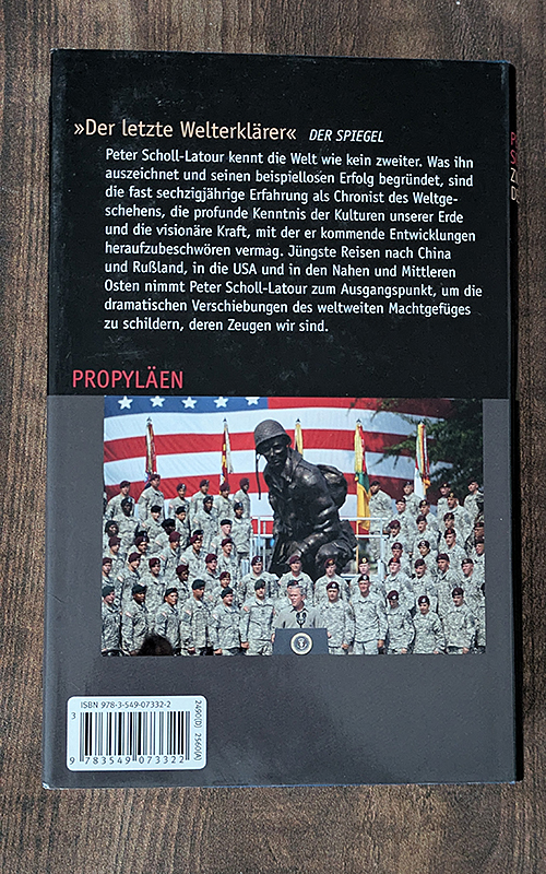 Gemeinsam mit dem TV-Redakteur Gero von Boehm ist Peter Scholl-Latour im Jahr 2007 noch einmal an wichtige Stationen seines Reporterlebens gereist - nach China, in den Nahen Osten und in die USA, aber auch ans Grab Charles de Gaulles, des grossen europäischen Staatsmannes. Überzeugend gelingt es ihm, von diesen Schauplätzen aus die neuen Achsen der Macht zu beschreiben, die hinter der Fassade einer im Umbruch begriffenen Welt erkennbar werden.