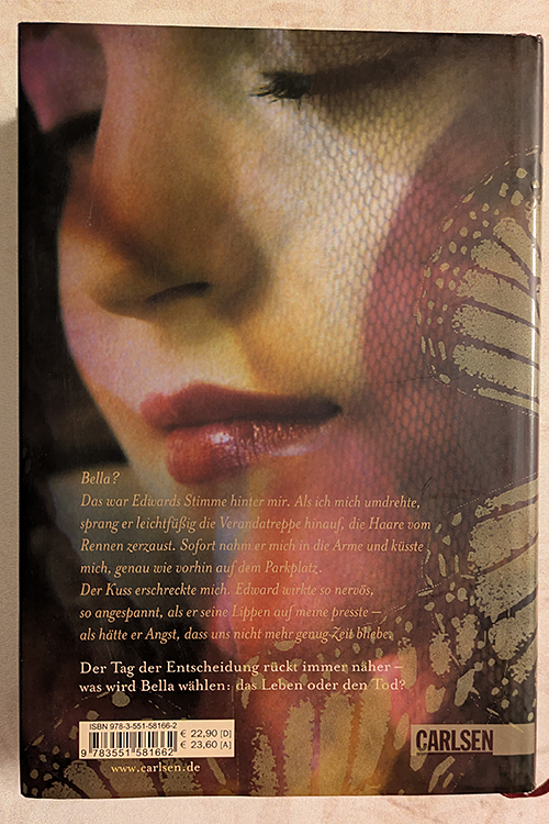 Bella? Das war Edwards Stimme hinter mir. Als ich mich umdrehte, sprang er leichtfüssig die Verandatreppe hinauf, die Haare vom Rennen zerzaust. Sofort nahm er mich in die Arme und küsste mich, genau wie vorhin auf dem Parkplatz. Der Kuss erschreckte mich. Edward wirkte so nervös, so angespannt, als er seine Lippen auf meine presste - als hätte er Angst, dass uns nicht mehr genug Zeit bliebe.