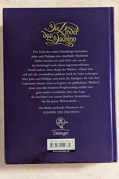 Gefährliche Reise: Zusammen mit ihrem Onkel werden die Dschinn-Zwillinge John und Philippa von einem langjährigen Freund, zu einem Dschinnverso Turnier nach New York eingeladen. Während Philippa sich an einer Dschinn Party vergnügt, streift John durch das Museum. Wieder zurück in der alten Villa, erfährt er von seinem Onkel Nimrod, dass alte Inka Relikte aus dem Museum gestohlen worden sind. Alles deutet darauf hin, dass die Diebe damit in die vergessene Inkastadt Paititi gelangen wollen. Doch ein Fluch, der die ganze Welt vernichten könnte, liegt auf der Inkastadt. Zusammen mit Onkel Nimrod und einer Freundin machen sich die Zwillinge auf in den Südamerikanischen Dschungel, um das grosse Unheil abzuhalten. Doch zur gleichen Zeit ist auch schon eine andere Expedition unterwegs, um das dunkle Geheimnis zu lüften. Ein gefährliches Abenteuer, mit vielen Hindernissen beginnt. Ein gelungener, ausgesprochen fantasievoller, äusserst spannender Fantasyroman. Dschinn Liebhaber werden begeistert sein, da es von der ersten bis zur letzten Seite im wahrsten Sinne des Wortes unheimlich, gruselig zu und her geht. Ab 12 Jahren, *****, Jeannette Grischott.