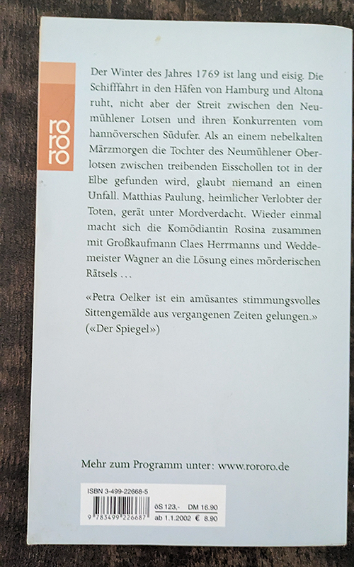 Kriminalroman. Vinteren 1769 er bitterlig kold og Hamburgs havn ligger øde hen. Da en ung pige bliver fundet død i Elben er der ingen der tror det er en ulykke og den unge piges forlovede bliver straks taget i forvaring
