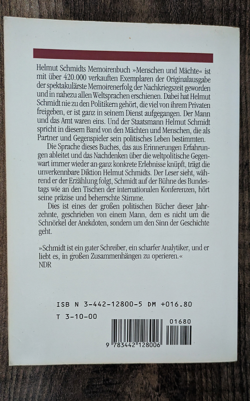 Den tidligere forbundskanslers politiske selvbiografi med bl.a. personlige indtryk af statsmænd og politik i Sovjet, USA og Kina og om Tysklands rolle i Europa.