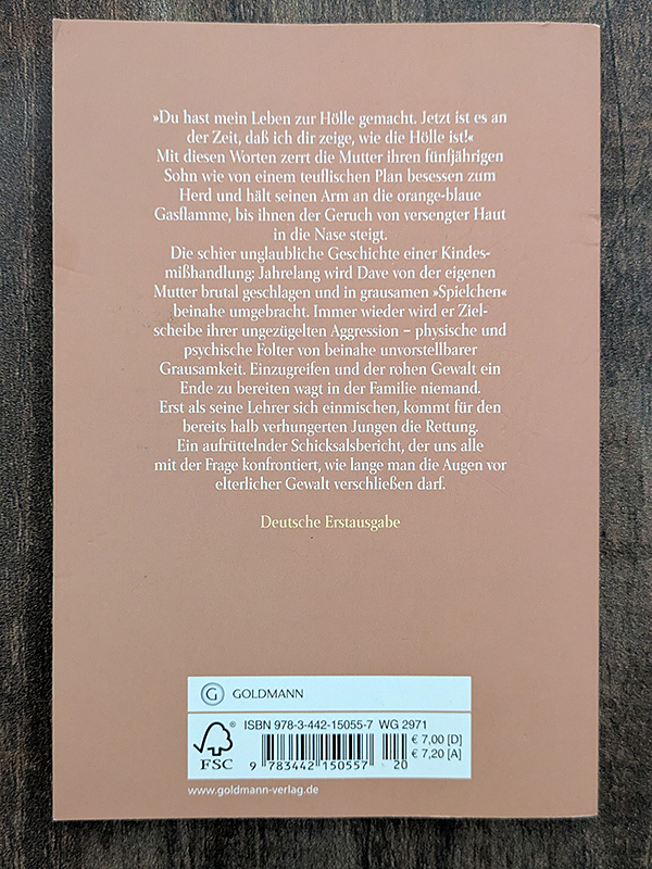 Das Trauma einer Kindheit: Dave wird von der eigenen Mutter gequält und mißhandelt. Von blauen Flecken übersät und halb verhungert, fällt der Junge auf, weil er Mitschülern das Pausenbrot stiehlt. Bis seine Lehrer es wagen, gegen die Mutter einzuschreiten, vergehen Jahre. Es gelingt ihm, sich aus der Hölle zu befreien. Ein erschütternder Bericht, geschildert aus der Perspektive des kleinen Jungen, der uns alle mit der Frage konfrontiert, wie lange man die Augen vor elterlicher Gewalt verschließen darf.